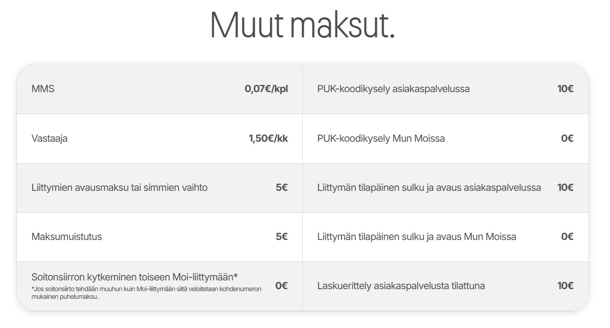 Esimerkkejä muista Moi-liittymän käyttöön liittyvistä maksuista. Tarkista ajantasaiset hinnat aina suoraan Moi Mobiilin verkkosivujen hinnastosta.